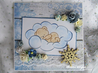 The cute teddy sleeping in the clouds has tempted me for long, but in the end I filled the frames with other cards. However, I really wanted to try this cutie and so when I started crafting again after a tiny break, it was his turn.