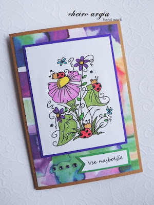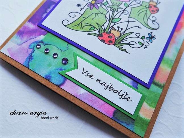 As usual, I coloured the scene with regular colour pencils. Thinking of autumn asters, I decided to use purple on the flowers, meaning I'd have a rather unusual colour scheme to work with from the start. Nevertheless, I found the result to be pretty much OK, so that I soon began to search for the perfect background. I thought about using some purple here, too, but once I found this multi-coloured sheet of scrapbook paper in one of my paper blocks it struck me that this could be *the* one instead. I did, however, use a piece of dark purple cardboard to enhance the main image and opted for a kraft card base instead of a white one. Once I decided on where to place the digi, I took a pre-printed birthday sentiment from my stash. I put it on a piece of green cardboard, and added a couple of purple gemstones for the bling, but I felt like I don't need to add anything else.